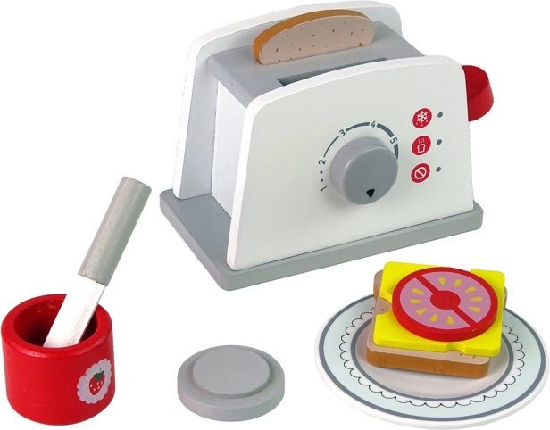 Ud over brødristeren indeholder sættet også brødskiver, kniv, glas marmelade, osteskive og tomatskive til at lave de bedste sandwiches. Træforarbejdningen er robust, behagelig at røre ved og skånsom mod små hænder.