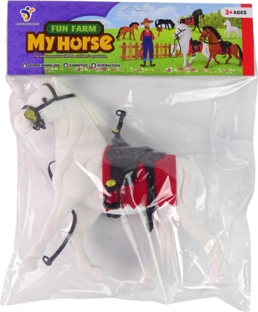 Realistisk figur af en hvid hest med sort sadel og rød voj til små elskere af stalde og gårde. Fremstillet af kvalitetsmateriale, behageligt at røre ved, med lang man og hale ideelle til at rede og flette. Et fantastisk supplement til børns samling af figurer og til kreativ leg fra 3 år.