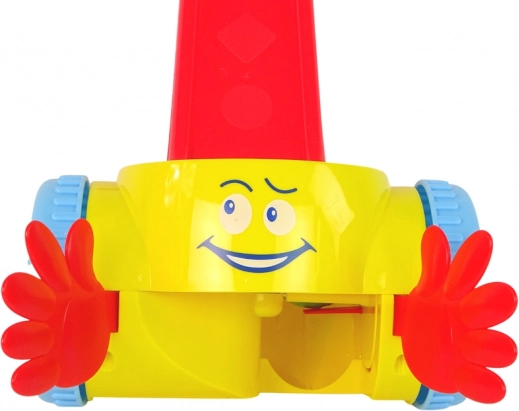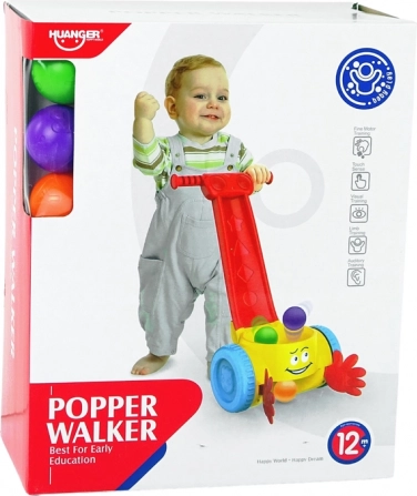 Denne farverige skubbewogn med et smilende ansigt motiverer børn til at gå og lege aktivt. Barnet lægger en bold i åbningen i håndtaget, legetøjet sætter den i rotation, og bolden hopper ud på gulvet – klar til at blive samlet op igen! Legen udvikler naturligt grov- og finmotorik, hånd–øje-koordination og løsning af simple opgaver.