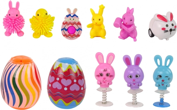 - Indhold af sættet (18 stk): 2 store pop it (gulerod og æg), kanin – kryds og bolle, lille pop it, 2 plastæg, spinner med pop it, kanin på hjul, 4× squishy, 3× hoppende kanin, kylling og kanin med knopper, 2 kaninfigurer.