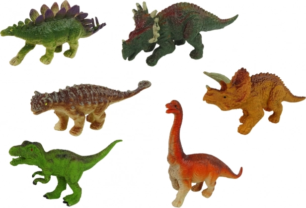 Seks detaljerede figurer i hård gummi viser trofast forskellige dinosaurarter. Ideelle til leg og læring om forhistoriske dyr.