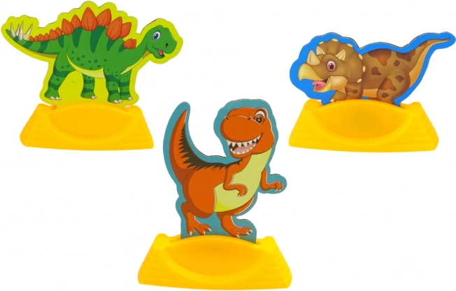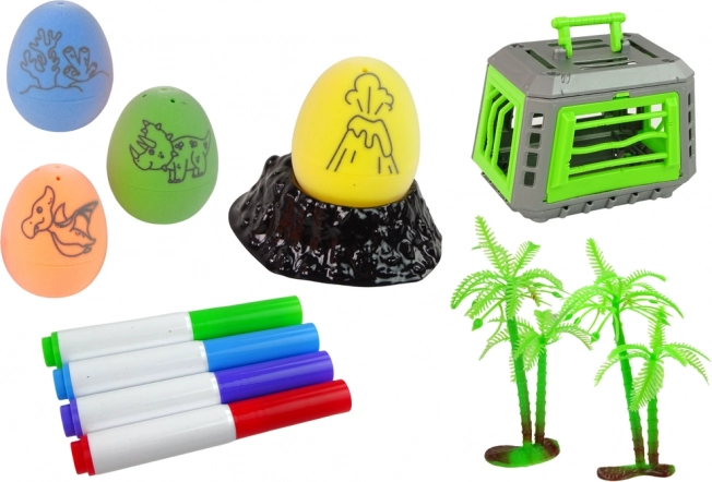 Lav dine egne dinosauræg – skallen har en fortrykt skitse, og børn kan farvelægge efter fantasien. To standere i vulkanform sikrer stabil udstilling.