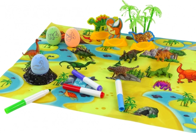 - 4 æg til maling, 6 dinosaurfigurer, transportkasse, 2 standere i vulkanform, legeunderlag, dekorationer
