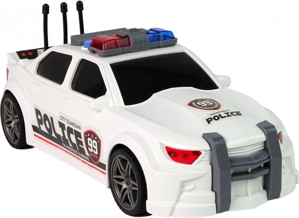 Hvid sportsvogn med teksten City Guardian Police og markante mærkater virker autentisk og understøtter kreative politimissioner.