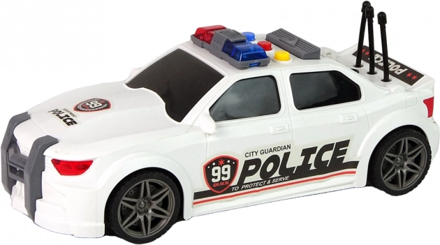 Hvid politisportsvogn i skala 1:16 giver børn masser af action og fantasi. Ved aktivering glæder den med lyd af motorstart, politiets sirene og effekter af høj fart. Detaljerede politimærkater og robust plastkonstruktion gør den til en fantastisk gave til små betjente. Nyt produkt i original emballage.