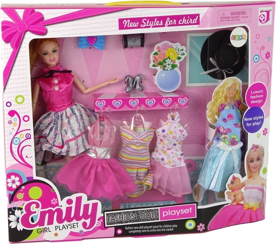 Dukken Emily vil glæde enhver lille stylist. Hun har et elegant outfit med lyserød top og en blomstrende, udvidet nederdel, som kompletteres af sorte pumps. Takket være de bevægelige led kan du nemt stille hende i forskellige positurer. Sættet indeholder flere kjoler og tilbehør, så hun kan se anderledes ud hver dag.
