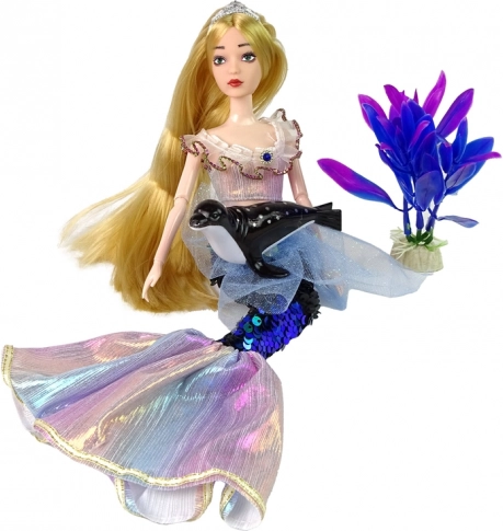 Opdag en magisk verden med dukken Emily havfrue! Hun har langt blondt hår, en glitrende tiara og en vendbar paillet‑hale i grøn‑lilla nuancer, som skifter til sort, når man stryger over den. Halen kan tages af, så børnene også kan lege med hende som en klassisk dukke. Med sødt tilbehør – en sort‑hvid sælfigur og en akvarieplante til endnu mere fantasifulde historier.