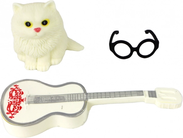 Dukken Emily charmerer med et elegant look: gennemsigtig hvid bluse med detaljer, brun nederdel med sorte prikker og hvide sneakers. De lange blonde hestehale-satte lokker fuldendes af sorte briller. Den hvide guitar med lyserød dekoration indbyder til kreativ leg og fortælling af egne historier med den trofaste killing ved hendes side.