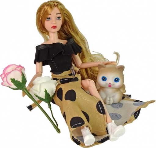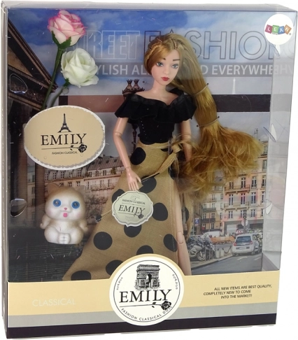 Dukken Emily er klædt i en elegant sort bluse og en lang beige nederdel med prikker. Hun har langt hår, der er ideelt til at rede og lave frisurer, et realistisk malet ansigt med blå øjne og er fuldt positionerbar takket være leddene. I sættet finder du også en sød killing og dekorative roser, som beriger hverdagshistorier og rollelege i familien.