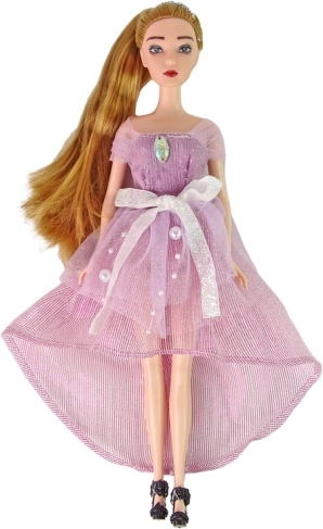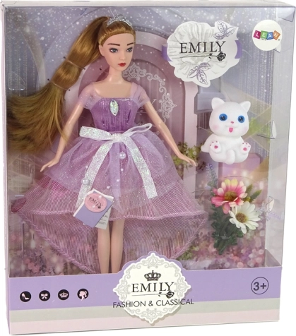 Bring magi ind i dit barns leg med dukken Emily. Hun har langt blondt hår samlet i en hestehale, bærer en lang rosa-tonet kjole med perler og sløjfer, en tiara på hovedet og elegante højhælede sko. Sættet fuldendes af en hvid killing med blå øjne og dekorative blomster.