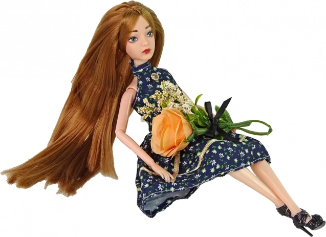 Stilfuld dukke Emily med lange kastanjerøde hår og blå øjne vil begejstre små modeelskere. Hun har leddede lemmer til realistiske poser, bærer mørk kjole med blomsterprint og pumps med hæl. Inkluderer også en dekorativ rose. Ideel størrelse til børnehænder og perfekt som gave.