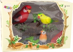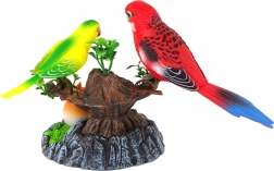 I pakken finder du to papegøjer – en rød og en gul – siddende på en trægren samt en lille fugleunge i et æggeskal. Fuglene på grenene laver forskellige lyde og bevæger sig, så du kan føle dig som i naturens favn, mens den lille fugl lyser med farverigt lys. Tryk blot på den sorte knap for at aktivere legetøjet.