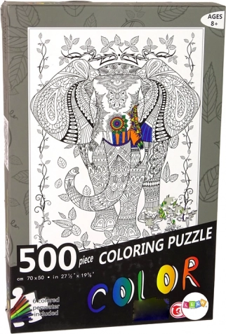 Dyk ned i en verden af kreativ underholdning med 500 sort-hvide puslespilsbrikker og 6 tuscher til at farvelægge dem med. Læg motivet af en elefant omgivet af blade, og udstil det stolt som vægdekoration eller som bordskåner.