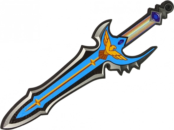 Det detaljerede blå sværd med dekorativt greb ligger let i hånden og passer perfekt til skjoldet for et komplet ridderudstyr.