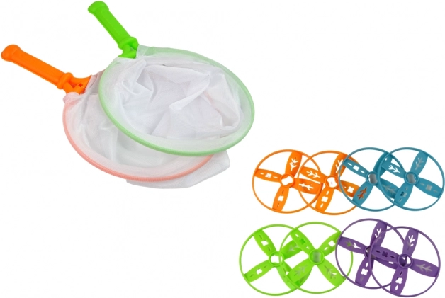 Færdighedsspillet Fang frisbee til hele familien: katapult, 8 diske, 2 net og beskyttelsesbriller. Udvikler reflekser og koordination. Sjov inde og ude.