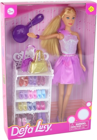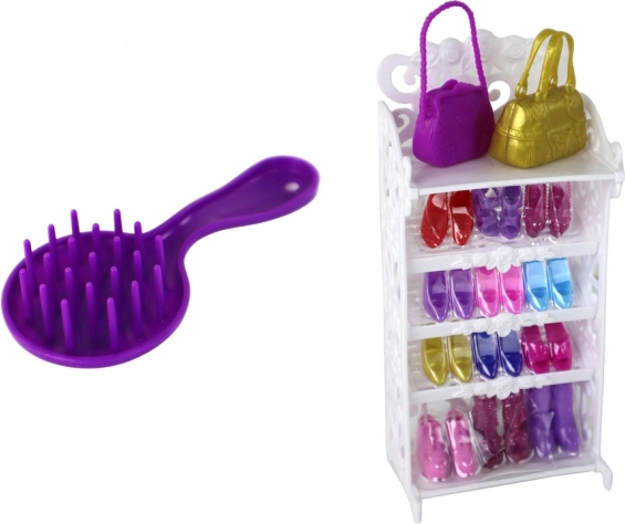 Hele sættet omfatter også et hvidt skab til sko og tasker, en lyserød hårbørste til at ordne dukkens lange blonde hår, og det hele er pakket i en original æske med målene 32 cm x 21 cm x 6 cm.