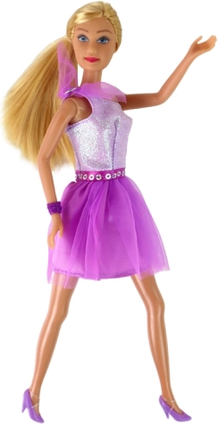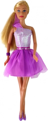 Kläd din dukke Lucy i hendes elegante lilla kjole med glitrende overdel og udsvinget skørt. Til kjolen hører også et lilla bælte pyntet med pailletter, som fremhæver hendes silhuet.