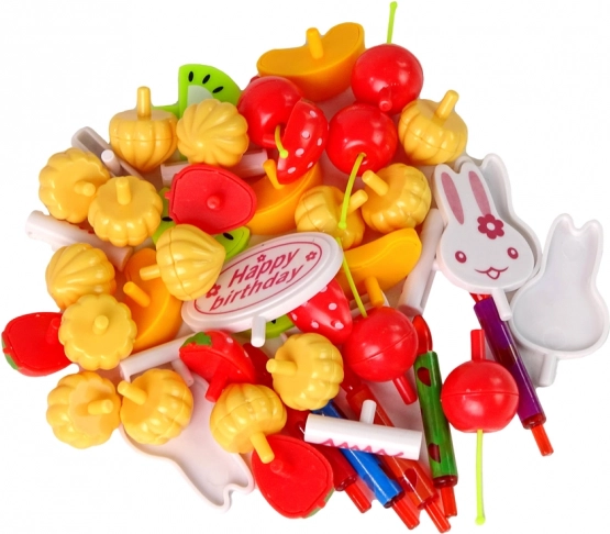 Hvert kagestykke kan takket være velcro gentagne gange samles og skilles ad, og der medfølger lys, toppere og frugt til fantasifuld pynt. Den solide plastkvalitet sikrer en sikker og holdbar legeting til daglig leg.