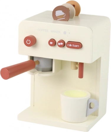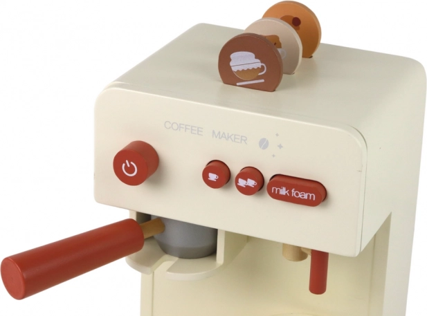 Denne træ-kaffemaskine efterligner en rigtig maskine, så børn kan føle sig som ægte baristaer. Betjeningen omfatter “tænd”-knap, valg af én eller to kopper og funktion til mælkeskum, hvilket stimulerer fantasien og efterligning af daglige aktiviteter.