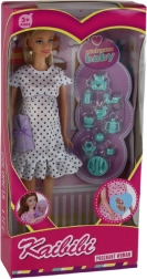 Dukken praler af et elegant look i hvid kjole med sorte prikker, lyserøde sko, og moden fuldendes med en lille taske.