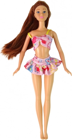 Dukken i sættet har et stilfuldt todelt strandoutfit og langt brunt hår, hvilket gør hende til den ideelle ledsager til enhver fantasifuld leg.