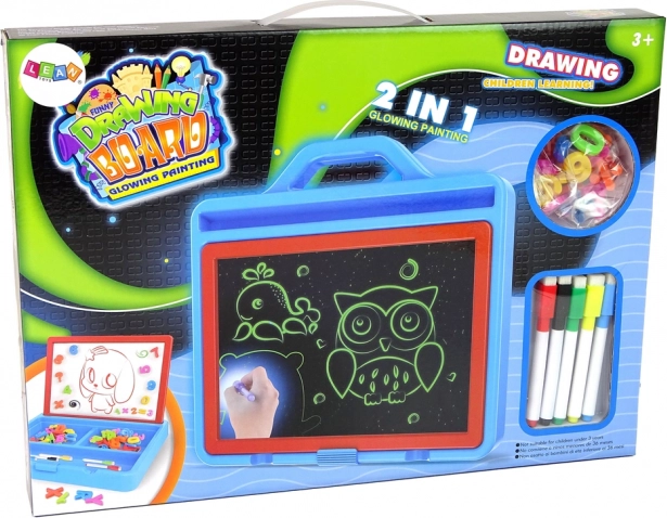 Denne børnetavle støtter fantasien og læring på en sjov måde. Med den LED-tusch kan børn skabe strålende billeder på den særlige plade, som nærmest vækkes til live i dæmpet lys. Den anden side fungerer som en hvid tavle til skrivning og tegning med aftørlige tuscher, så de kan øve bogstaver, tal og de første regnestykker igen og igen.