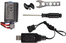 Med i pakken: båd, 2,4 GHz controller, antikollisionsdæksel, batteri, USB-opladekabel, reserveskrue, nøgle, skruetrækker, stander og manual.