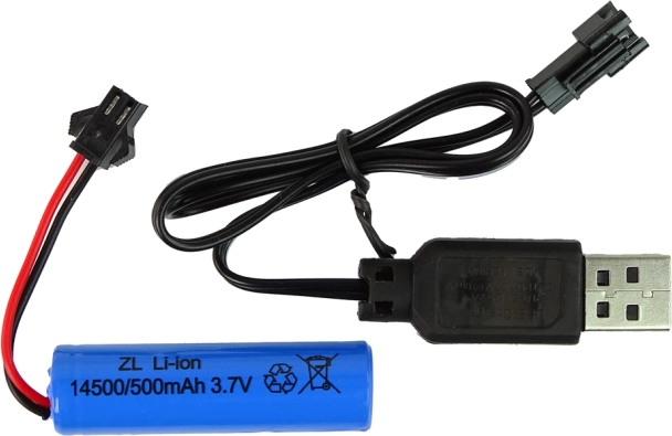 Pakken inkluderer et genopladeligt batteri 14500/500mAh 3.7V med USB-kabel til nem opladning.