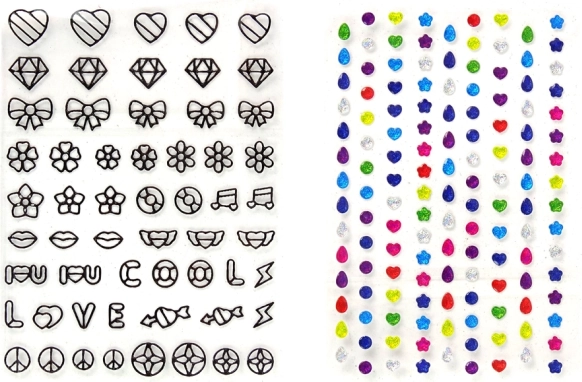 Dekorative klistermærker og farvede “sten” giver manikyren glans og originalitet. Personliggør hver negl efter humør.