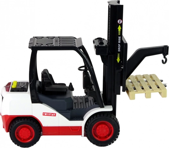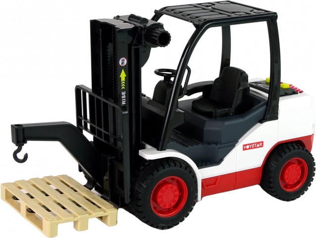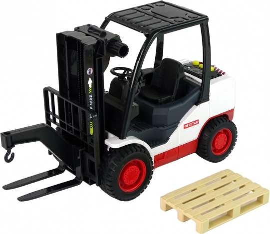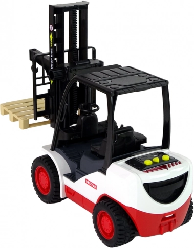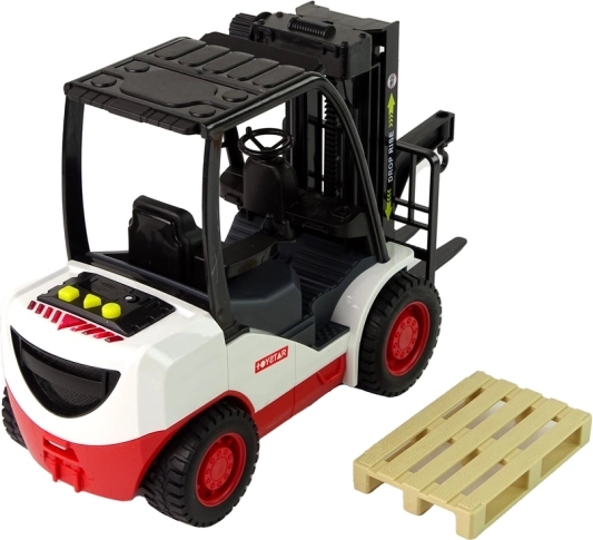 Denne detaljerede gaffeltruck begejstrer alle små fans af arbejdsmaskiner. Med det drejelige betjeningshjul kan gaflerne let hævnes og sænkes, mens tre realistiske lyde og et rødt lys ved tryk på de gule knapper forstærker legeoplevelsen. Der medfølger en aftagelig palle til lastning og losning.