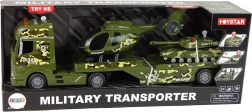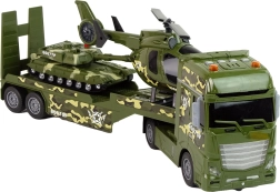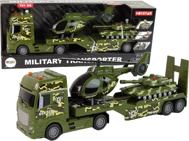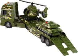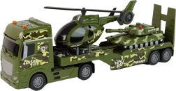 • Komplet 3-i-1 sæt – lastbil med anhænger, helikopter og tank