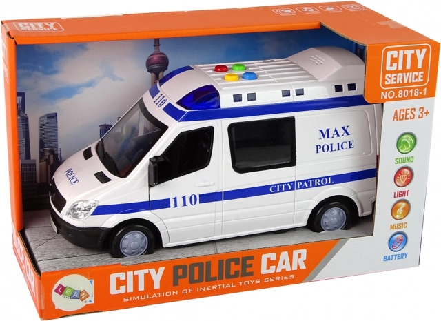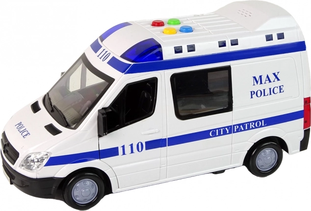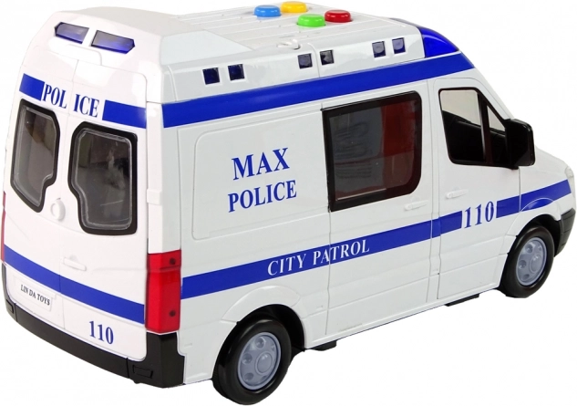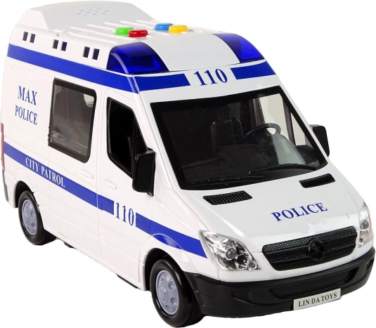 Denne detaljerede politivan efterligner et rigtigt køretøj. Børn bliver begejstrede for kombinationen af lys og lyde, der styres af farvede knapper på taget, og friktionsdrevet, som får den til at køre, når man trækker den tilbage og slipper. De åbnebare for- og bagdøre gør det nemt at laste besætning og udstyr.