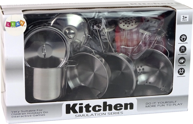 Sættet med metalgryder og køkkentilbehør er beregnet til små madentusiaster. Snehvide og sølvfarvede elementer giver et realistisk udseende og understøtter udviklingen af børns fantasi og deres kulinariske færdigheder.