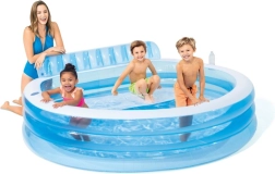 INTEX oppustelig familiepool tilbyder rummelig badning for både børn og voksne, en integreret bænk med ryglæn for behagelig afslapning og kopholdere for maksimal komfort. Det holdbare PVC-materiale, den hurtigudtømningsventil og den medfølgende selvklæbende reparationslap gør den til et ideelt valg til haven på varme dage.