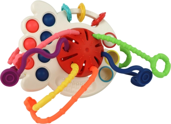 Sjovt og sikkert legetøj til de mindste, som understøtter sanseudvikling og finmotorik. Barnet vil nyde at trække i de farvede snore, trykke på bobler og skubbe dem. Kombinationen af blød silikone og holdbart ABS sikrer komfort, sikkerhed og lang levetid. Ideel derhjemme og på farten.