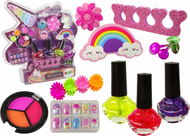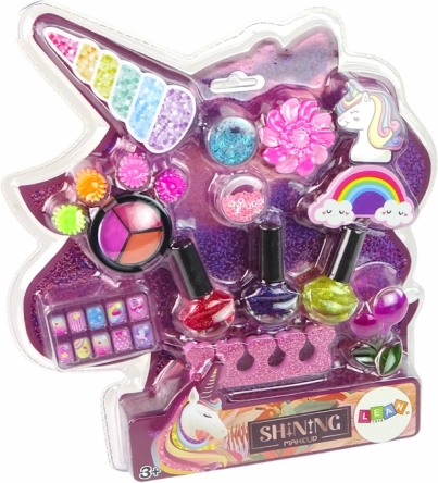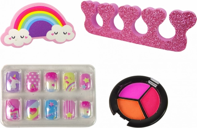 Øjenskygger i tre farver - lyserød, orange og rød - giver mulighed for at eksperimentere med forskellige makeupstile. Kunstige negle med enhjørningemotiv tilføjer stilen eneståendehed. En æske med dekorative stjerner formet som pailletter gør det muligt at skabe imponerende effekter på både negle og makeup.