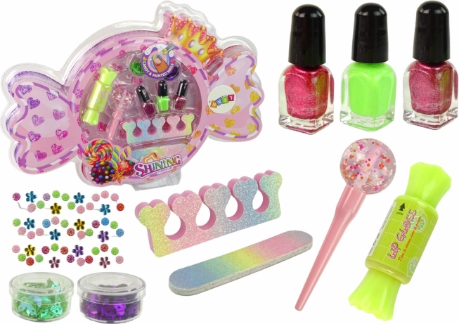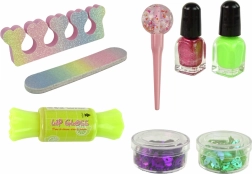 Dette smukke kosmetiksæt indeholder mange attraktive elementer, der vil glæde enhver ung stilentusiast. En tåadskiller hjælper ved lakering af negle, mens to lipgloss tilfører charme og glans. En neglefil og tre neglelakker, hvoraf to med glitter og én i en klar farve, gør det muligt at dekorere neglene kreativt med forskellige mønstre.