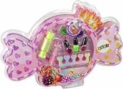 Der medfølger også dekorative klistermærker og to beholdere med dekorative glimmer, ideelle til at skabe effektfulde dekorationer. Det er et komplet udstyr til små kosmetikkunstnere.