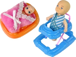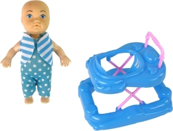 Dette sæt inkluderer også en anden dukke – en lille dreng klædt i blå-hvidt med blå øjne, som tilfører variation til legeoplevelsen. Forskelligt tilbehør som kam, potte, sut, flaske og gåstol fuldender pakken for en komplet og engagerende leg.