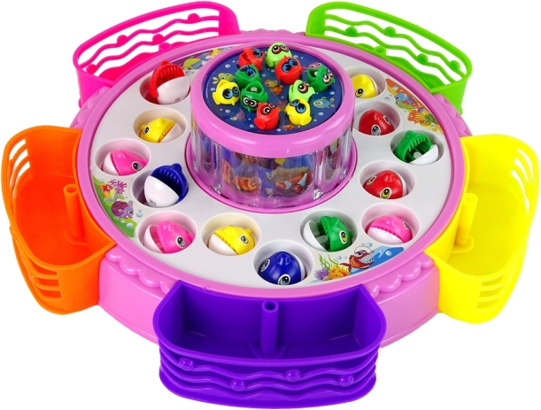 Når du tænder for spillet, drejer pladen, lyser og afspiller lyde, som fanger børns opmærksomhed og gør fiskeriet endnu sjovere.