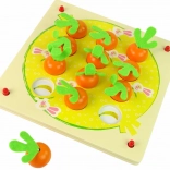 Den solide træplade med glatte huller og farverige frugt- og grøntsagsfigurer ligger godt i små hænder og støtter finmotorikken.