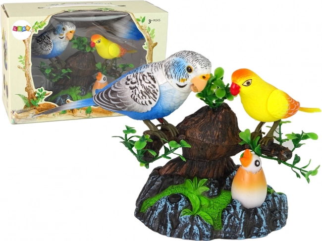 Sættet indeholder to papegøjer – en blå og en gul – placeret på en trægren samt en lille papegøje i en skal, der ligger nedenunder.