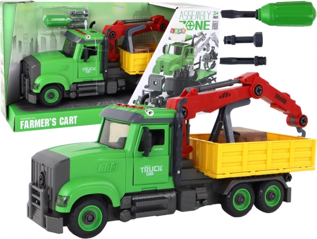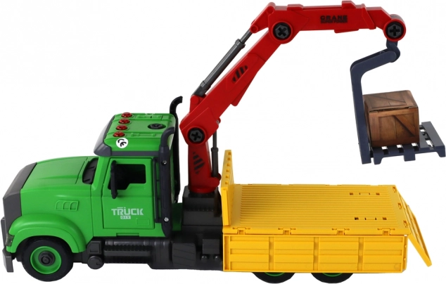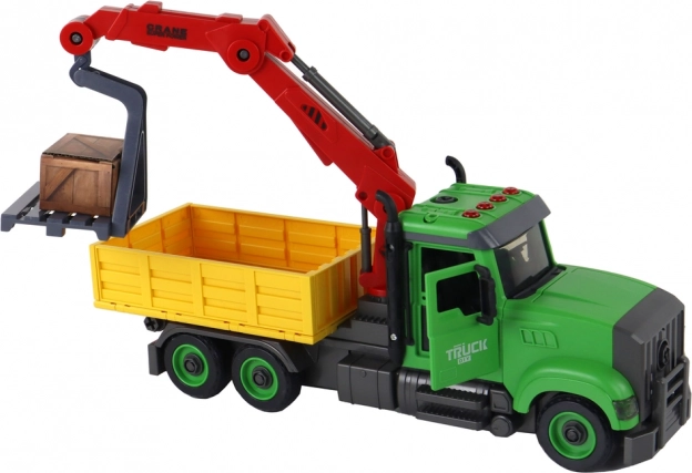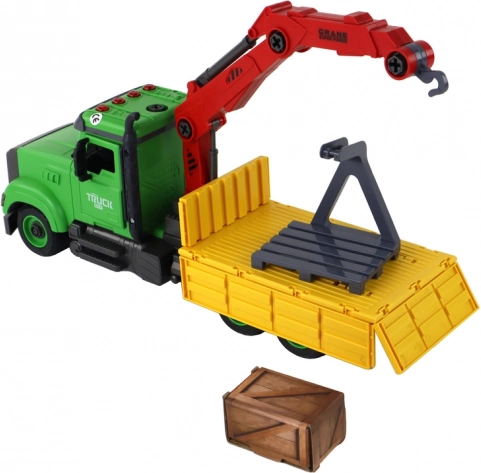 - Dumpbil med kran, skruetrækker med to bits, palle med kasse, batterier (3 × 1,5 V)