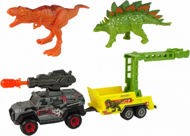 Dette dinosaursæt tager børn med tilbage til fortidens verden. Du finder en TYRANNOSAURUS i brun-orange nuancer og en STEGOSAURUS i grøn med en iøjnefaldende orange kam langs ryggen. Den terrængående vogn er udstyret med en raketkaster med bevægelig projektil og en trailer med metalgitre til sikker transport af “forhistoriske” skabninger.