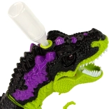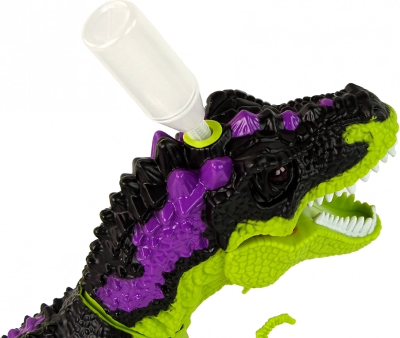 På dinosaurens hoved er der en åbning, hvor du kan hælde vand i ved hjælp af den medfølgende flaske. Med en knap på fjernbetjeningen (kører på 2 AA-batterier – medfølger ikke) kan du slippe damp ud gennem dens mund og skabe en glødende ild-effekt. I pakken finder du også en fjernbetjening udformet som en dinosaurklods, hvormed du kan styre dens fremadgående bevægelse.