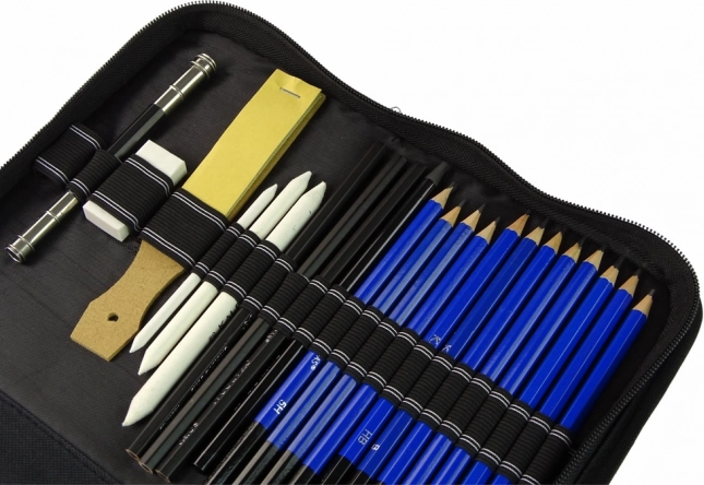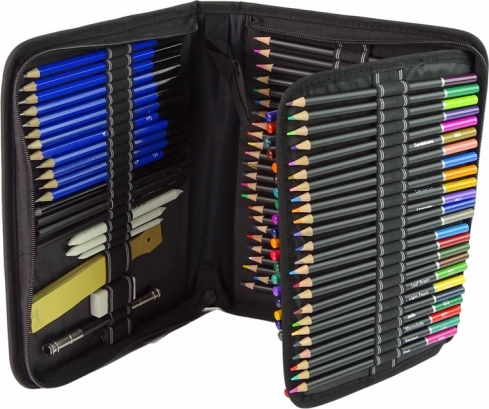 - 72 farveblyanter; 12 grafitblyanter i forskellige hårdheder; kul i 3 hårdheder; 3 blender-stumps + renseværktøj; viskelæder; blyantspidser; blyantforlænger