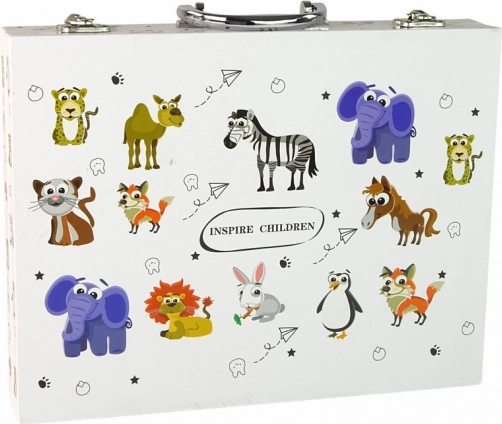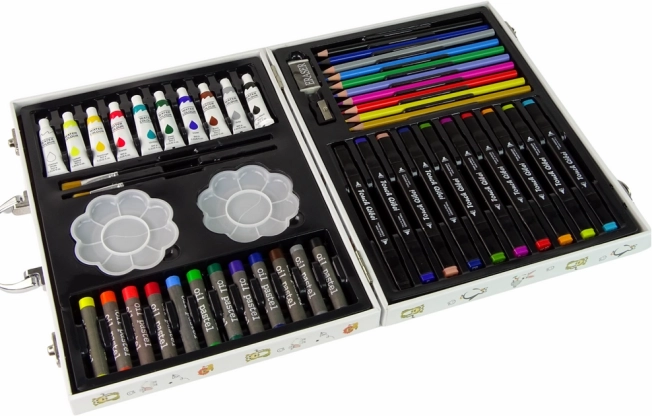 Denne alsidige kreative kuffert er den perfekte gave til børn, der elsker farver og fantasi. Takket være de overskueligt organiserede redskaber har små kunstnere alt ved hånden – de kan tegne, male og blande nuancer. Det praktiske design med metalhåndtag og lukning sikrer nem transport og sikker opbevaring af alle materialer.