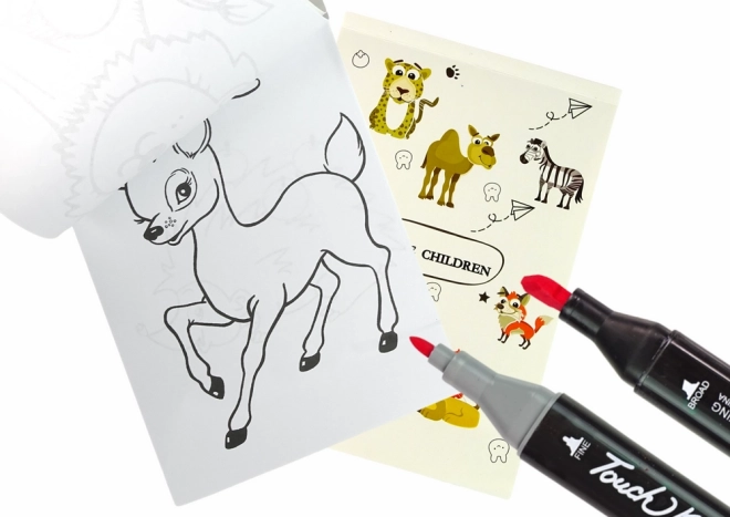 Sættet inkluderer 10 tuber farve (6 ml), 2 pensler til flader og konturer, 2 plastpaletter i blomsterform, 12 oliepasteller, 10 klassiske farveblyanter, 10 tuscher med dobbelttip, viskelæder, blyantspidser og en malebog med 20 dyremotiver. Alt er klar til øjeblikkelig kreativ leg – hjemme, på ferie eller i skolen.