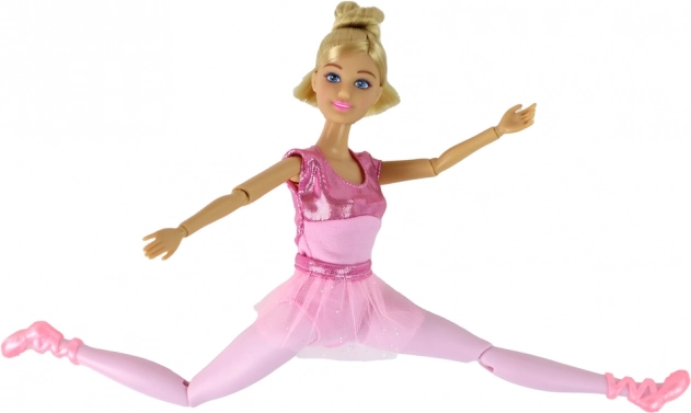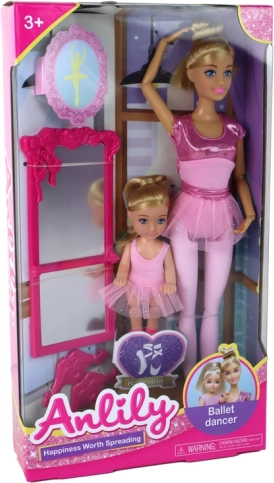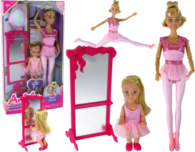 Elegant balletmor i rosa kostume med glitrende detaljer og tylskørt lærer sin lille ballerina de første piruetter. Begge dukker har rosa balletsko og langt blond hår sat til danseundervisning. Det store rosa spejl med dekorationer skaber en magisk scene til daglig træning og store forestillinger.