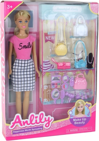 Oplev en magisk modeverden med dette sæt til små stylister: indeholder ANLILY-dukke med langt blond hår, stilfuld kjole, makeuptilbehør og hårstyling samt fem forskellige håndtasker til enhver lejlighed. Legen udvikler kreativitet, finmotorik og fantasi og er ideel til børn, der elsker mode.